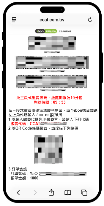 步驟2. 接著系統會產生個人【三段式繳費條碼】,請持該條碼至超商櫃檯繳費,個人【三段式繳費條碼】時效為10分鐘。